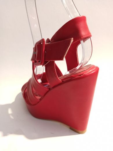 8888 Dolgu Topuk 11 Cm Toka Detay Kadın Sandalet Kırmızı Deri