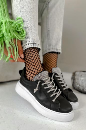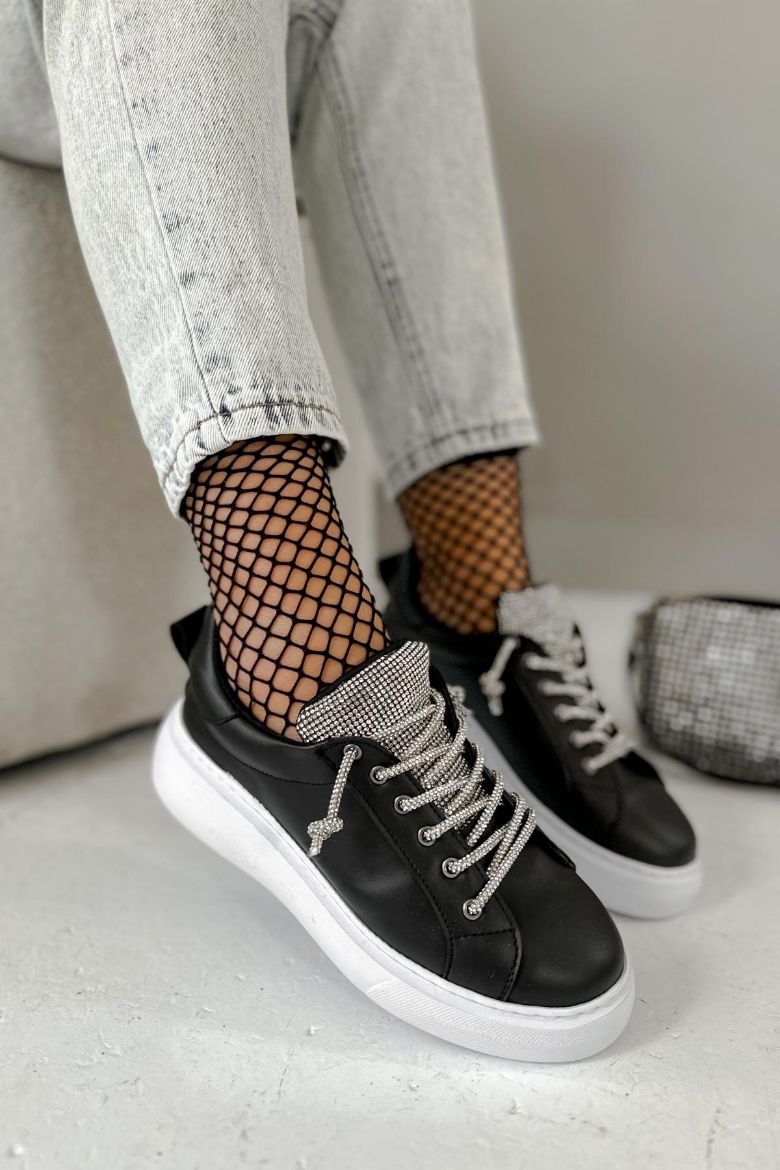 009 Taşlı Bağcık Detay Kadın Sneaker Spor Günlük SİYAH DERİ