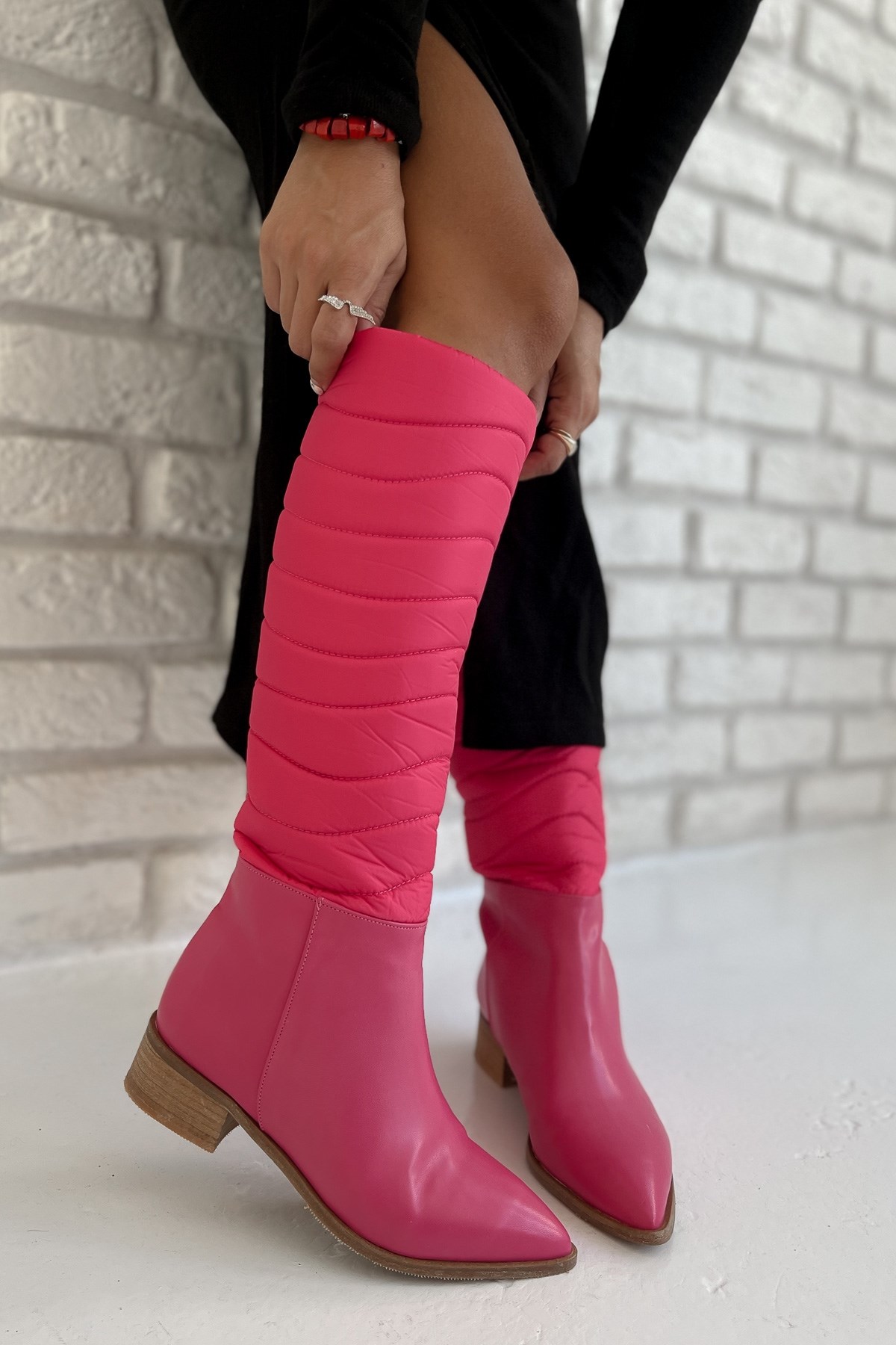 1047 Kadın Çizme Paraşüt Kumaş Ahşap Topuk Çizme Pembe