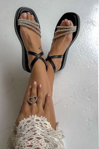 2005 Taş Detay 3 Sıra Günlük Kadın Sandalet SİYAH DERİ