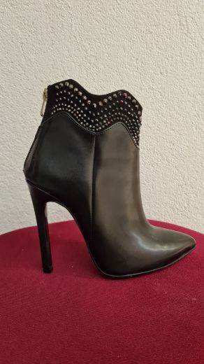 2241 Taş Detaylı Ince Topuklu Kadın Bot Siyah Deri