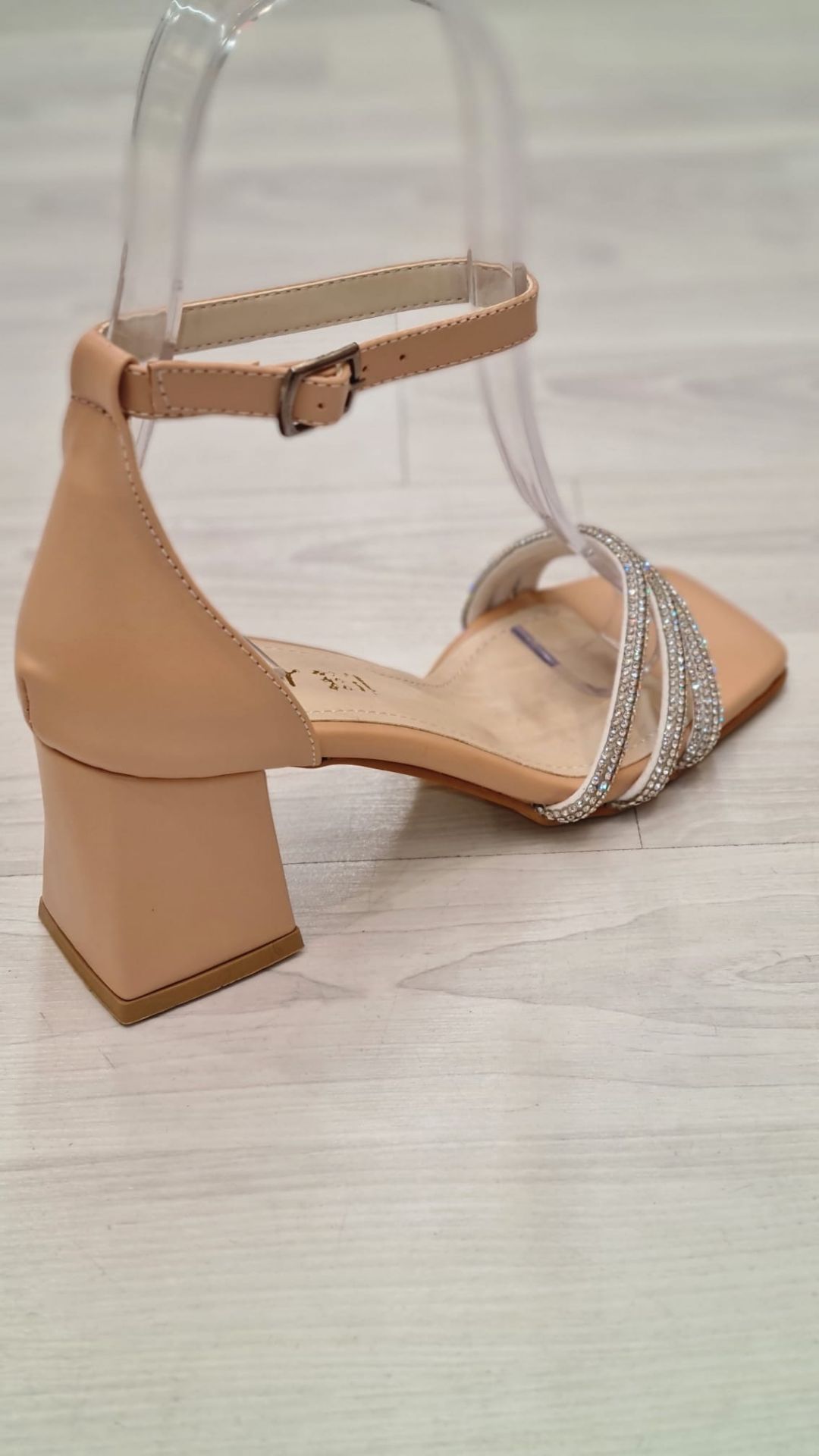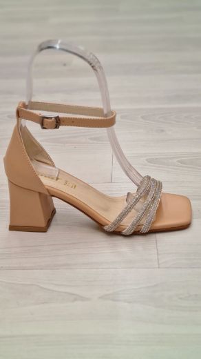 529 Üç Sıra Taş Detay 6 Cm Kalın Topuk Kadın Ayakk Bej Deri