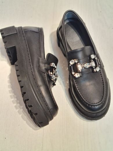 589 Taşlı Günlük Kullanışlı Kadın Loafer Ayakkabı SİYAH DERİ